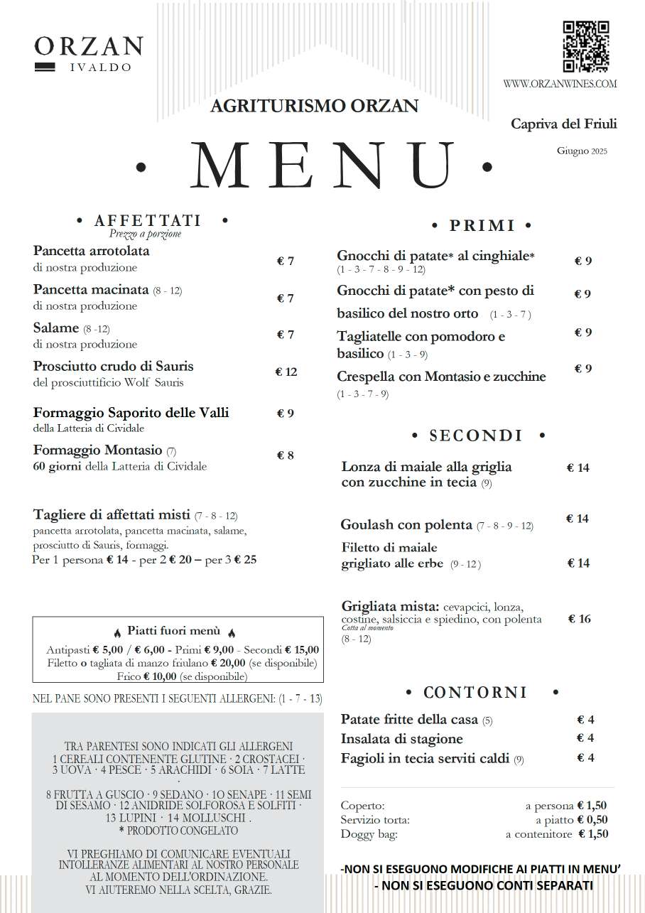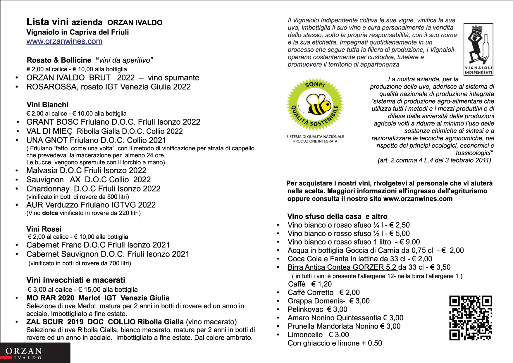 Dal 1994, all’interno della nostra azienda è attivo l’agriturismo dove si può pranzare e cenare nel fine settimana, degustando i piatti della tradizione friulana accompagnati dai nostri vini. I salumi sono di produzione propria come il salame, la sopressa o la pancetta oppure di aziende friulane come il prosciutto di Sauris.